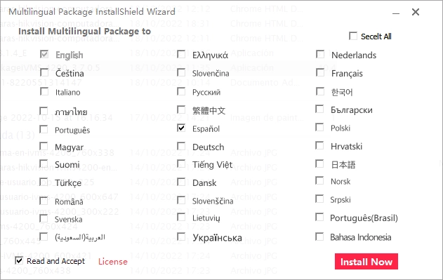 Luego abra el archivo, marque la casilla de términos de uso Read and accept, desmarque la casilla que dice Selecct All y seleccione el idioma español en la casilla correspondiente. Luego haga clic en el botón Install Now y después en Star Now.