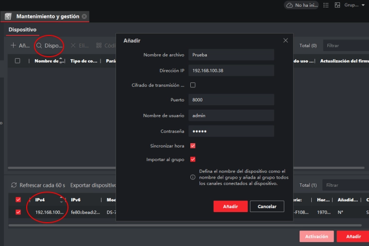 Para añadir dispositivos y verlos de forma local, debemos ingresar al menú de Mantenimiento y gestión y luego presionar en la opción de Dispositivo en línea (tiene una lupa como ícono al costado). Luego en la parte de abajo se va a desplegar una barra donde podrá ver el o los dispositivos que se encuentran en línea, con su número de IP, modelo, número de serie, entre otros datos.