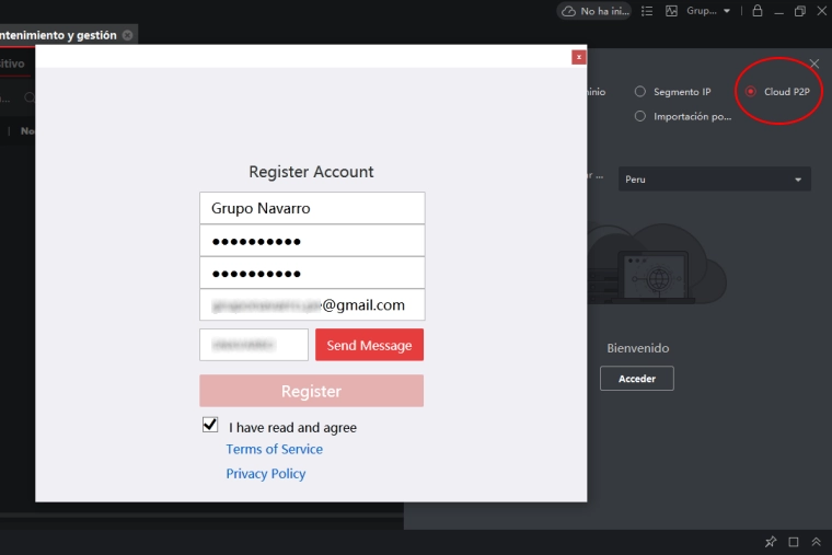 Para agregar dispositivos al iVMS 4200 y verlos por internet, debe tener o crear una cuenta en la plataforma Cloud P2P de Hikvision. Para ello debe ingresar al menú de Mantenimiento y gestión y dar clic en la opción de Cloud P2P. Se va desplegar una ventana donde tiene dos opciones: iniciar sesión Login o registrarse Register.