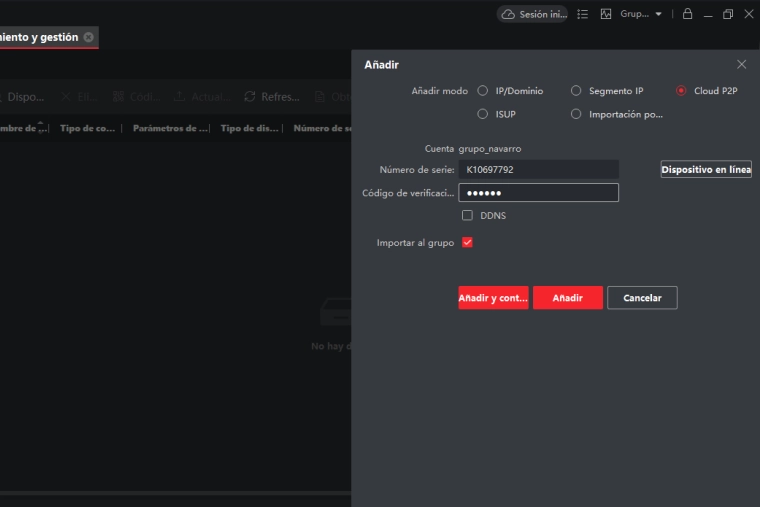 Ingrese el número de serie del equipo y el código de verificación del mismo. Debe dejar marcada la casilla de importar al grupo para que se añadan los canales de cada cámara a la vista principal.