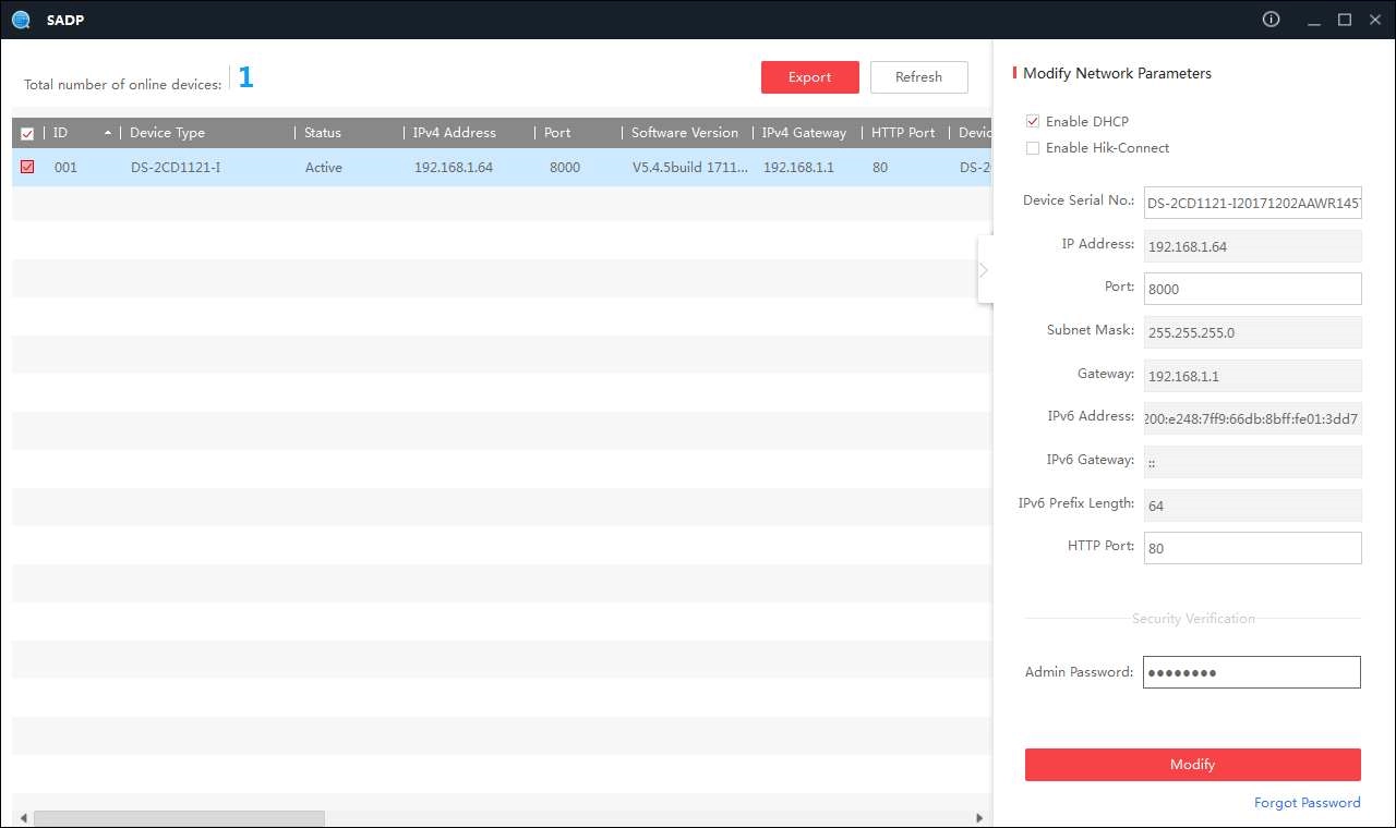 DHCP, ponemos nuevamente la contraseña y le damos aModify. Reiniciamos la cámara y presionamosRefresh, podremos ver que la IP a cambiado.